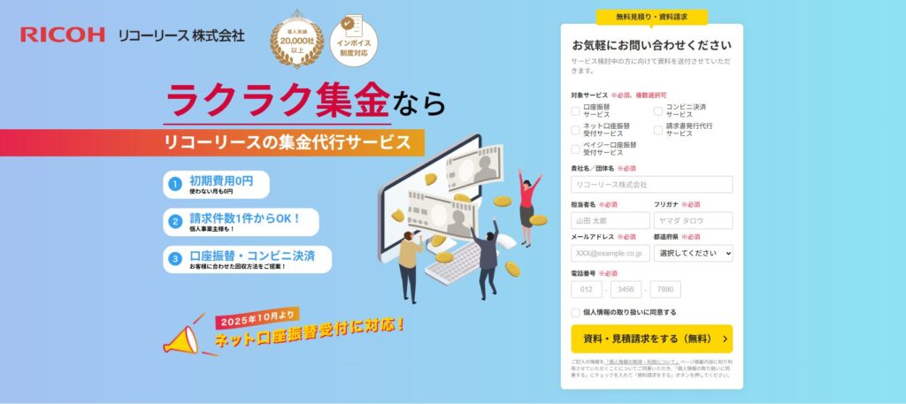 自社に合わせて、5つのサービスプランからカスタムメイドが可能です。専用システムやアプリの導入も不要なので、インターネット環境さえあれば気軽にサービスを利用できるでしょう。万が一残高不足や書類不備で引き落としができなかった場合も、自動的にコンビニ決済を案内してくれるので安心です。